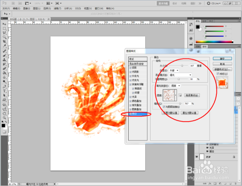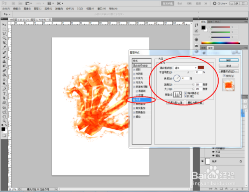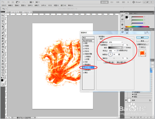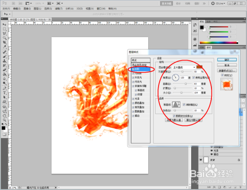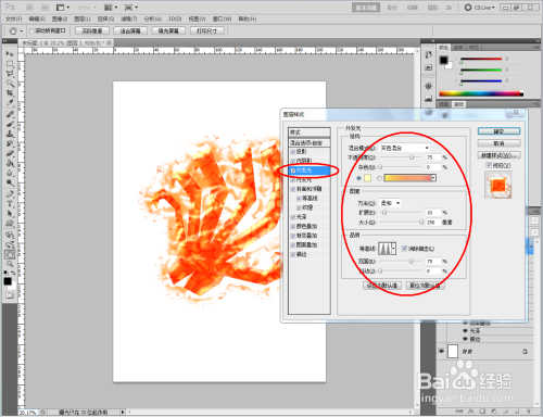 双击图示图层空白区域,弹出【图层样式】设置栏,按图示设置好图层样式的各个参数,完当作火焰结果(白底)的建造(如图所示);