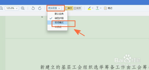 假如需要其他的颜色,好比夜间的暗色,同样点击改换布景选项,在弹出的选项中选择夜间模式即可;
