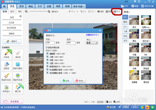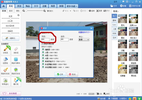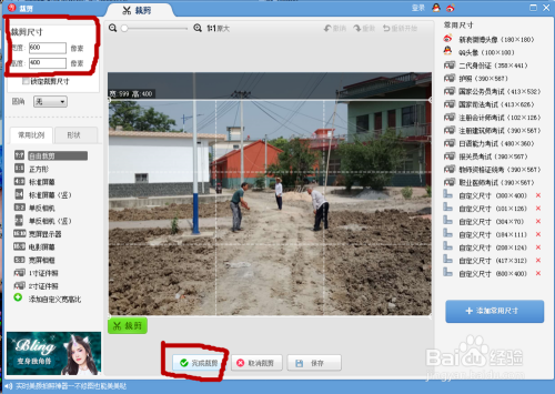4、裁剪,在尺寸选项旁边,在左上角宽度输入600,高度输入400,点击应用,完当作裁剪,保留即可;