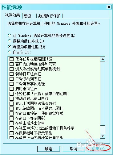 4勾选自界说模式,然后全数打消勾选。wind7的话可以直接选择第三项:调整为最佳机能,也是一样的。(缩略图的显示项按照大师的需要来勾选,否则图片文件等没有小图预览了哦)