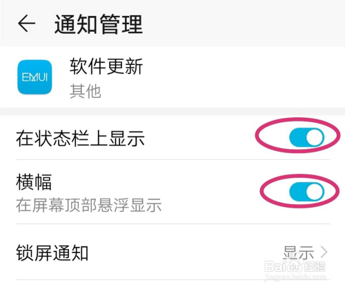 然后将【在状况栏上显示】和【横幅】封闭,下次手机系统更新后就不会提醒了。