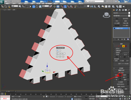 点击右边工作区中的【面】图标,按图示选中模子上的面后,点击【挤出】右边的小方框并设置好挤出的各个参数(如图所示);