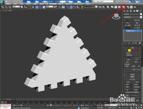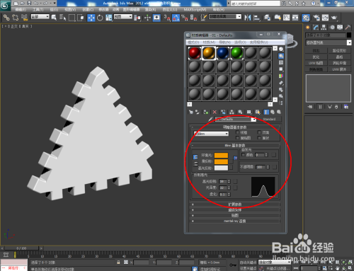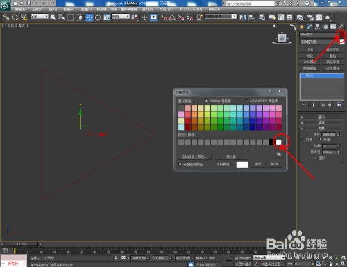 打开3Dmax2012软件,点击【建立】-【图形】-【多边形】,在作图区域绘制一个多边形图案并将多边形边数设置为:3,绘制出一个三角形图案。点击【对象颜色】将模子的对象颜色设置为:白色(如图所示);