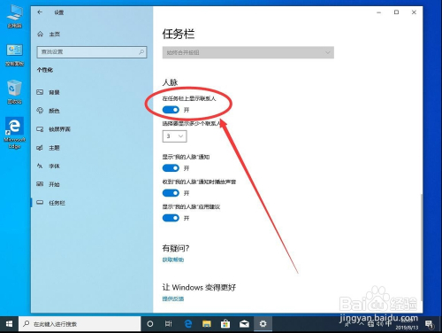 找到右侧“人脉”下面的“在使命栏上显示联系人”点击下面的开关,使其处于封闭状况,如图