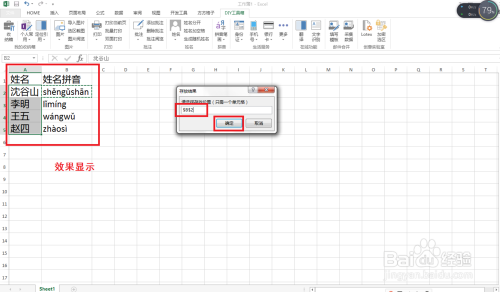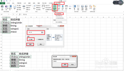 第五,点击确定后会弹出存放成果对话框——这里点击姓名拼音列的B2单位(只需要选择开首第一个单位格就可以了)——点击确定就会主动显示拼音在B列。