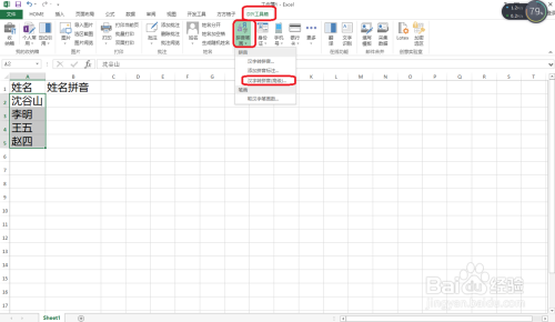 第三,点击EXCEL菜单栏上方的:DIY东西箱——点击:字拼音笔画,点击下方的下拉按钮——选择汉字转拼音(高级)。