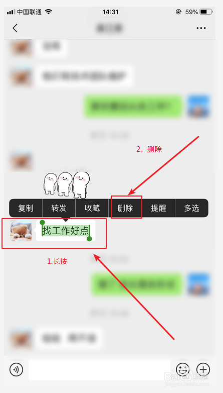 若是想删除某一条动静,打开聊天窗口:长按动静后会弹出删除,然后点击删除即可!