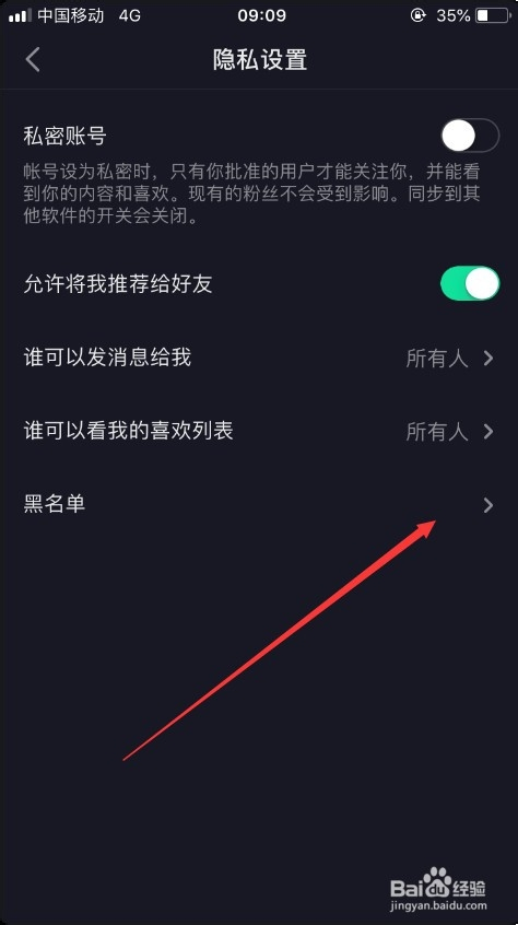 进入隐私设置之后,就可以看到“黑名单”的菜单,点击进入即可,如图所示。