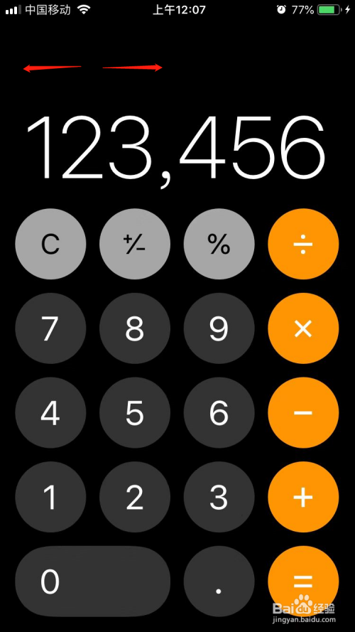利用iPhone计较器时,一不小心输错,如何撤销呢?只要在数字那边标的目的左或标的目的右滑动即可撤销之前输入的一位数,再也不消全删除从头输入了。(如图中红色箭头指示)