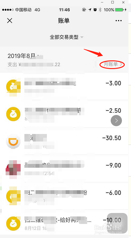 界面会显示比来消费的明细,点击右侧的月度账单