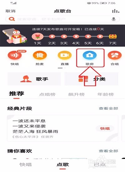 进入【点歌台】之后,第四个图标就是【歌房】,点一下【歌房】。