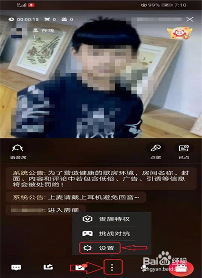 若是唱了好久了,想封闭歌房了,可以点击下方的三个上下并列的点,然后就会呈现【设置】,点一下【设置】。再点最下方的【闭幕歌房】,呈现是否闭幕歌房的提醒,接着点【闭幕歌房】,歌房就封闭了。