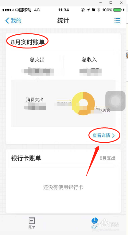 这时辰界面会有比来的消费环境,想知道月度账单,需要点击下方的统计