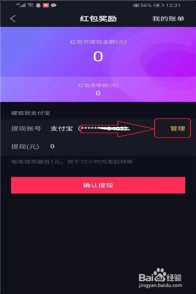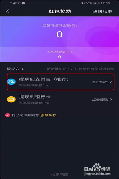 再回到【红包奖励】的页面,此时就可以看到提现体例的第一项提现到支付宝后面,不再是【点击提现】,而是【点击绑定】,申明已经解除了支付宝绑定。