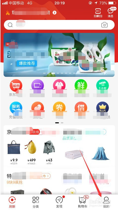 打开登录之后进入京东的首页,点击京东右下角的“我的”,如图所示。