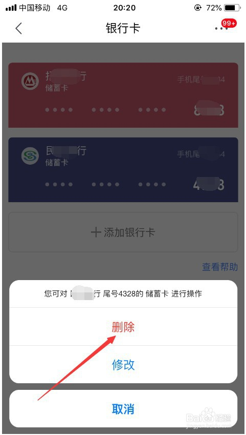 若是想要解绑某张银行卡,点击即可,然后就会弹出提醒,选择此中的“删除”即可,如图所示。