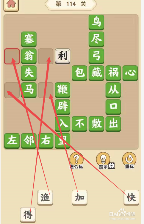 将“渔”字填在“翁”字左侧,将“得”填在“翁”和“利”之间,构成当作语“渔翁得利”,然后将“快”填在“马”左侧,将“加”填在“马”和“鞭”之间,构成当作语“马不停蹄”。