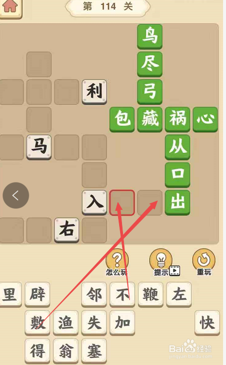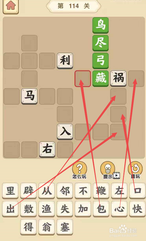 点击当作语小秀才手游,起头第一百零一十四关的当作语填字挑战。将“鸟”和“尽”填在“弓”字上面的空格内,将“藏”填在“弓”的下面,构成当作语“鸟尽弓藏”。