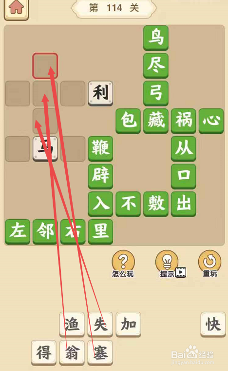 将“掉”填在“马”上,将“翁”填在“掉”上,将“塞”填在“翁”上,构成当作语“塞翁掉马”。