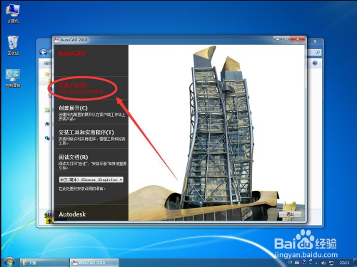 打开CAD2010安装界面,点击左侧第一个选项“安装产物”