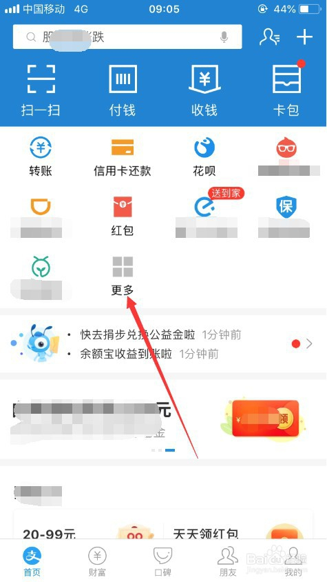 首先,打开登录支付宝,进入支付宝的首页,选择此中的“更多”,如图所示。
