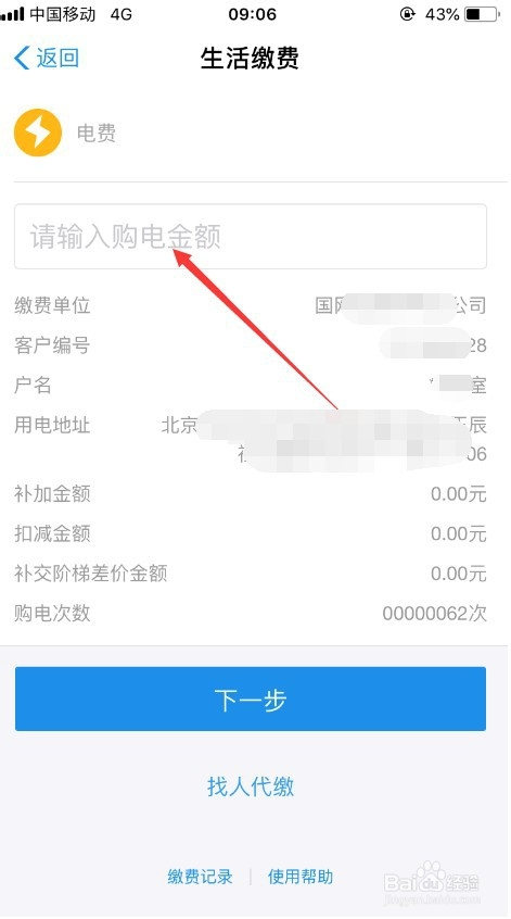 然后,若是是第一次缴纳电费,需要输入用户编号或者具体的栖身地址,因为小编已经缴纳过,所以存在记实,直接输入购电金额,点击下一步即可,如图所示。