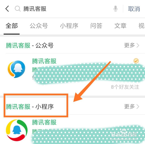 - 1打开微信,在最上方的搜刮栏搜刮腾讯客服。搜刮成果选择腾讯客服小程序。