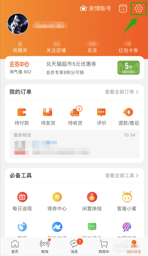 进入到‘我的淘宝’,可以看到本身所登录的账户的订单、萍踪等状况,选择右上角的小齿轮进入到‘设置’;