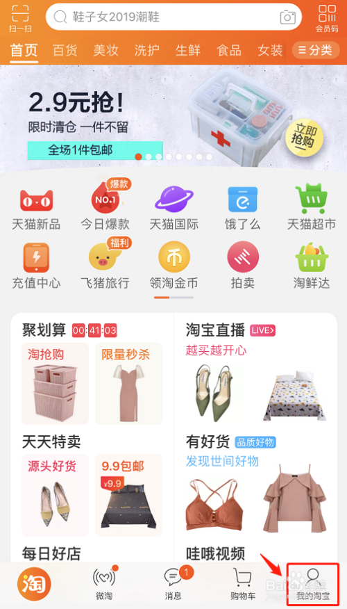 首先打开手机淘宝,进入到首页,然后下方题目栏选‘我的淘宝’;