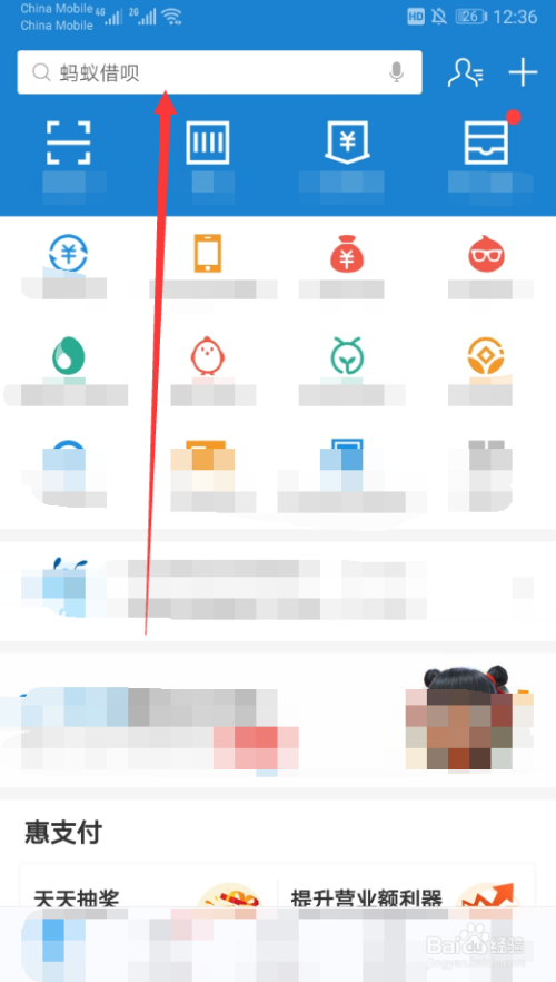 打开之后进入支付宝的本家儿页面安按照图中操作点击上方的搜索框