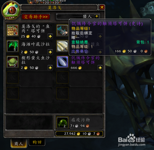 邪教徒的小指环和脉动的血石都可以在纳沙塔尔的小鱼人处倒货兑换,饥饿传令官的触须塔可饼则由莫洛戈出售,需要666金币,跟其他道具纷歧样的处所在于,饥饿传令官的触须塔可饼没有时候限制,可以提前买好了放在背包里等穆勒尔刷新坐骑。