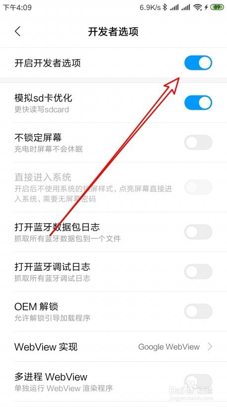 在打开的开辟者选项的页面中,我们点击“开启开辟者选项”后面的开关,把其设置为打开的状况就可以了。