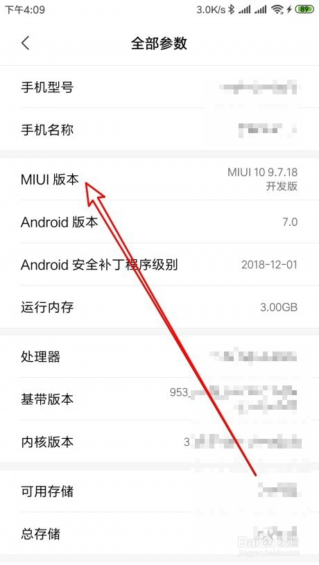 接下来在打开的全数参数的页面中,我们点击Miui版本的菜单项,持续快速点击7次