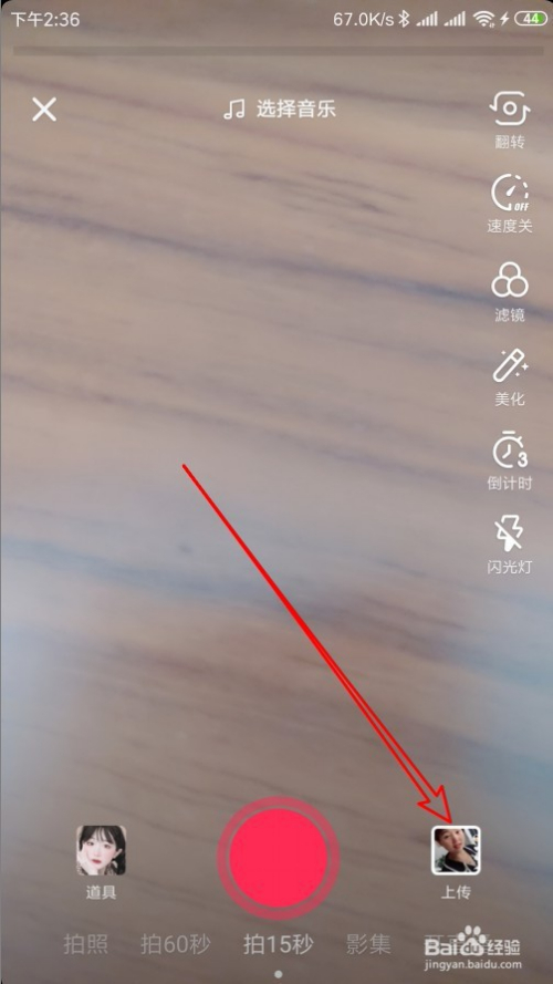 在打开的抖音短视频的拍摄视频软件本家儿界面,点击右下角的“上传”按钮。