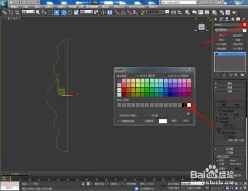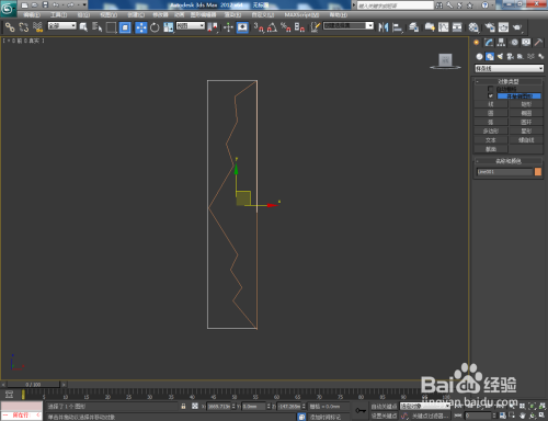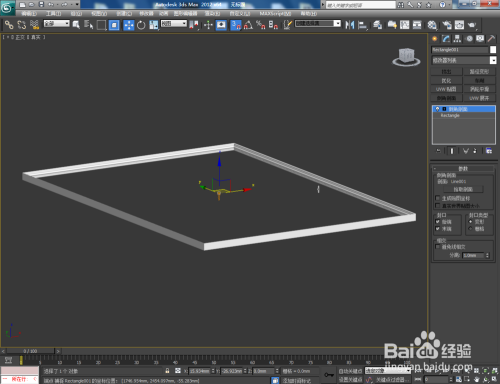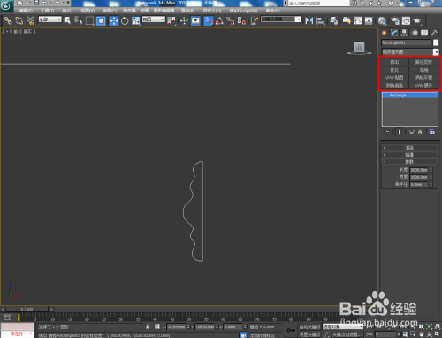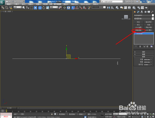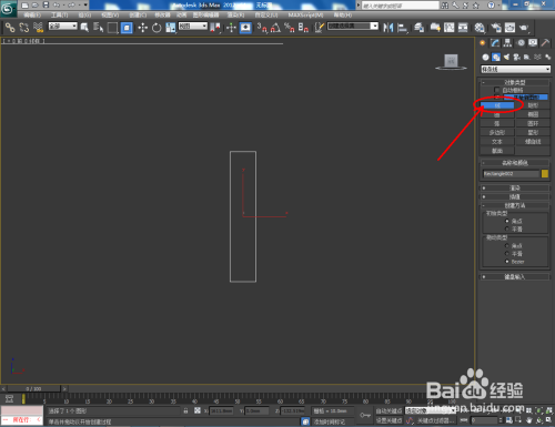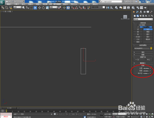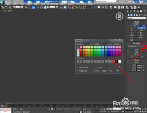 打开3Dmax2012软件,点击【建立】-【图形】-【矩形】,按图示在作图区域绘制一个矩形图案作为腰线路径并设置好矩形的各个参数。选中矩形图案,点击【对象颜色】将图案的对象颜色设置为:白色;
