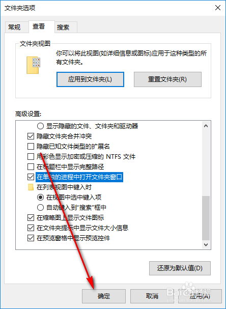 勾选对话框中的“在零丁的历程中打开文件夹窗口”;
