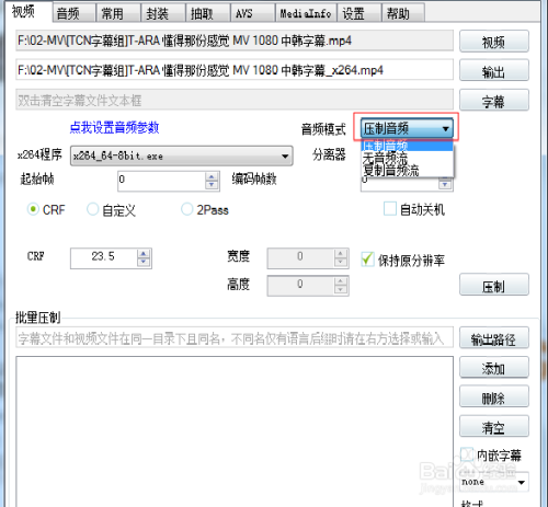 3、选择音频模式,要压制音频选音频压制,不压制音频选无音频流