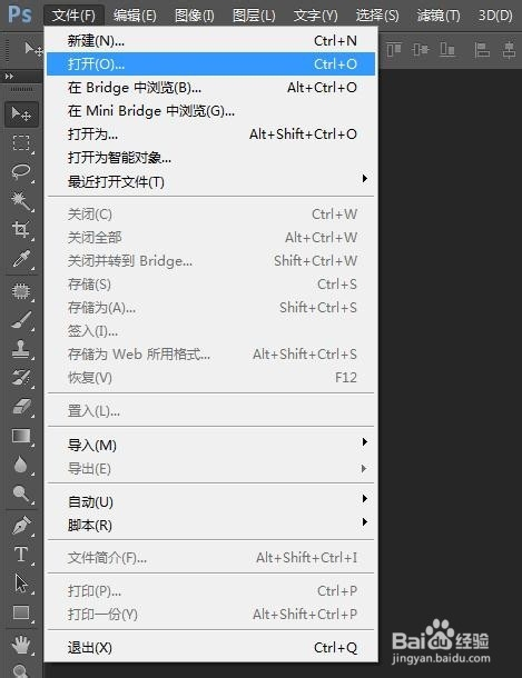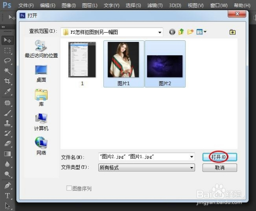 第一步:在PS中,单击选择“文件--打开”,按住Ctrl键同时选中两张图片,单击“打开”按钮。