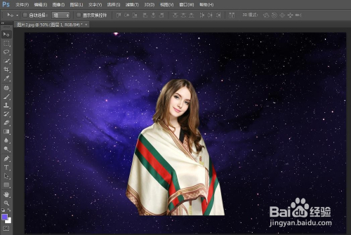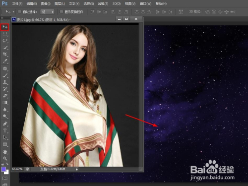 第七步:选择左侧东西栏中的“移动东西”,将人物拖动到星空图片中。