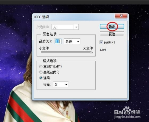 第十一步:在弹出的“JPEG选项”对话框中,选择最佳图像品质,并单击“确定”按钮,完当作操作。