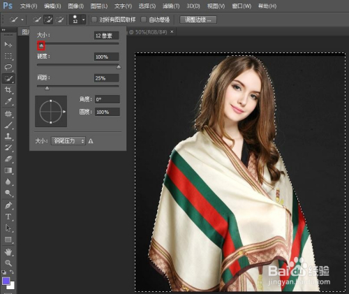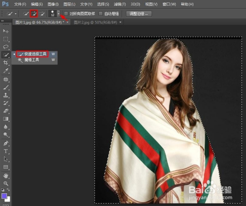 第二步:在左侧东西栏中选择“快速选择东西”,单击上方的添加到选区按钮,调整选择东西的大小,选中图片中的布景区域。