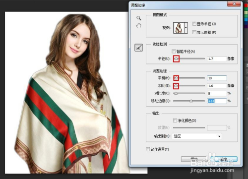 第四步:单击上方“调整边缘”按钮,在弹出的“调整边缘”对话框中,按照选区的转变,调整半径、光滑和成仙滑块。