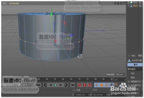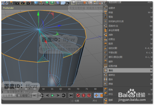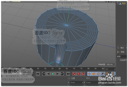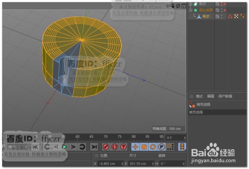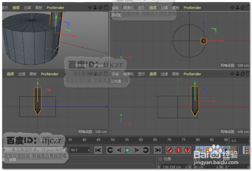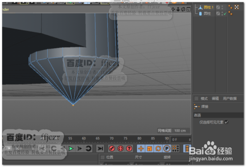 再次建立一圆柱,该圆柱的大小为开孔的大小;将圆柱转为可编纂对象,底部添加一圈节制边后将底部一圈点焊接到圆心处,获得钻头的尖部结果。经由过程四个视图调整钻头在圆柱上的位置。如图所示。