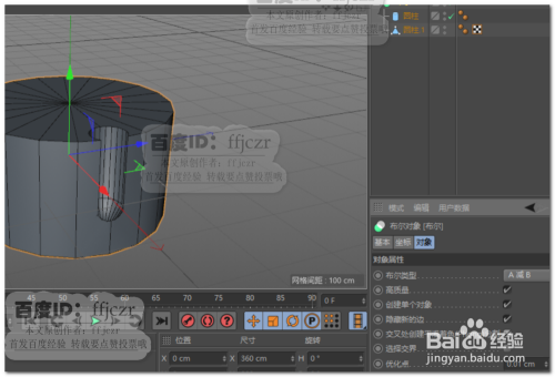 添加一个布尔,第一步的圆柱体为A,第二步的圆柱体为B;以A减B的体例进行布尔运算,勾选布尔属性中的建立单个对象,埋没新的边。