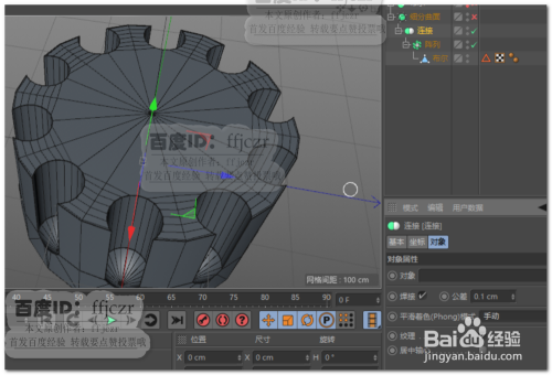 选择除了开孔区域的所有面,将其删除;给开孔多边形添加一个阵列号令,半径为0,副本为9;再对阵列组添加一个毗连号令,光滑着色模式改为手动;最后给毗连组添加一个细分曲面,获得圆柱体上不完全钻孔的硬边结果。