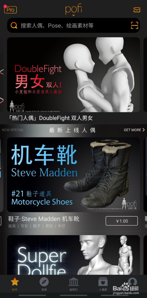 打开软件,下方的功能别离的“保举”“发现”“画师们”“人偶库”“我的”。