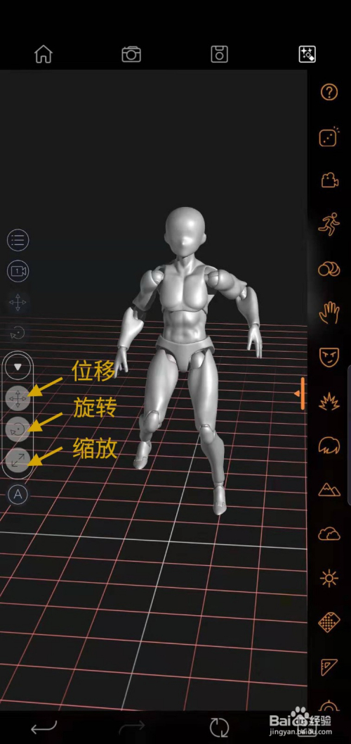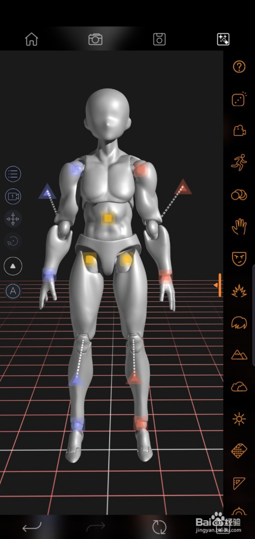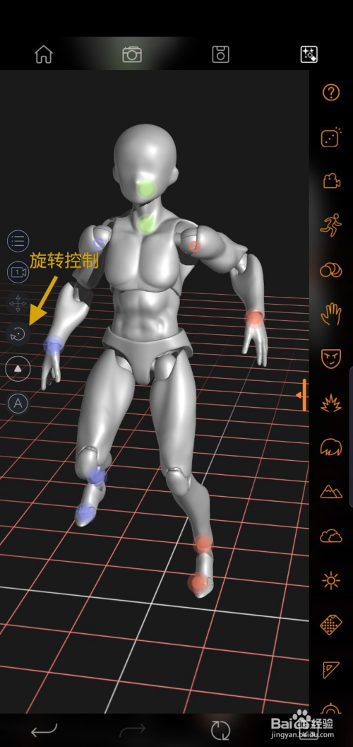 呈现关节节制点,可以调节人偶动作。手指扭转屏幕,调整角度。