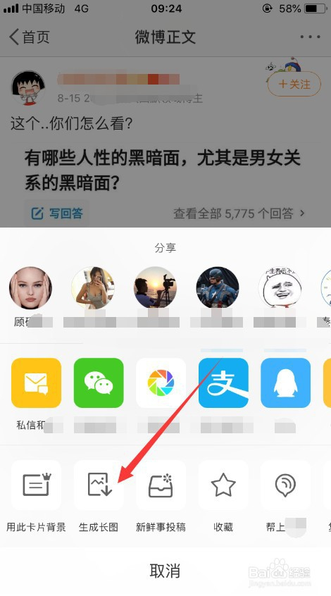 然后会从微博正文页面的下方弹出一个分享框,选择此中的“生当作长图”,如图所示。