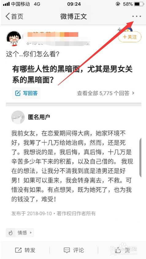 进入微博正文之后,点击微博右上角的“三个点”按钮,如图所示。