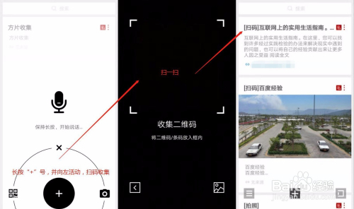 长按“+”号,并标的目的左滑动,进行扫描收集。经由过程扫描二维码/条形码,可将网页地址、下载链接、商品信息等内容保留到方片收集中。